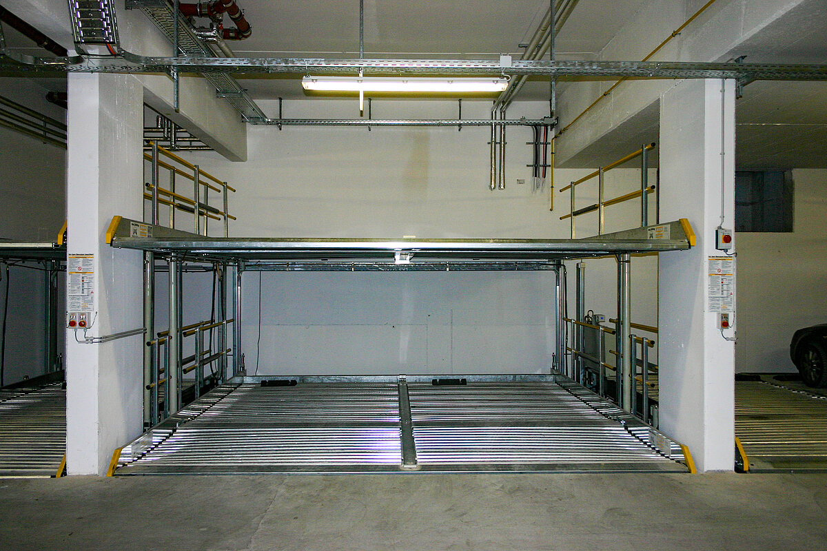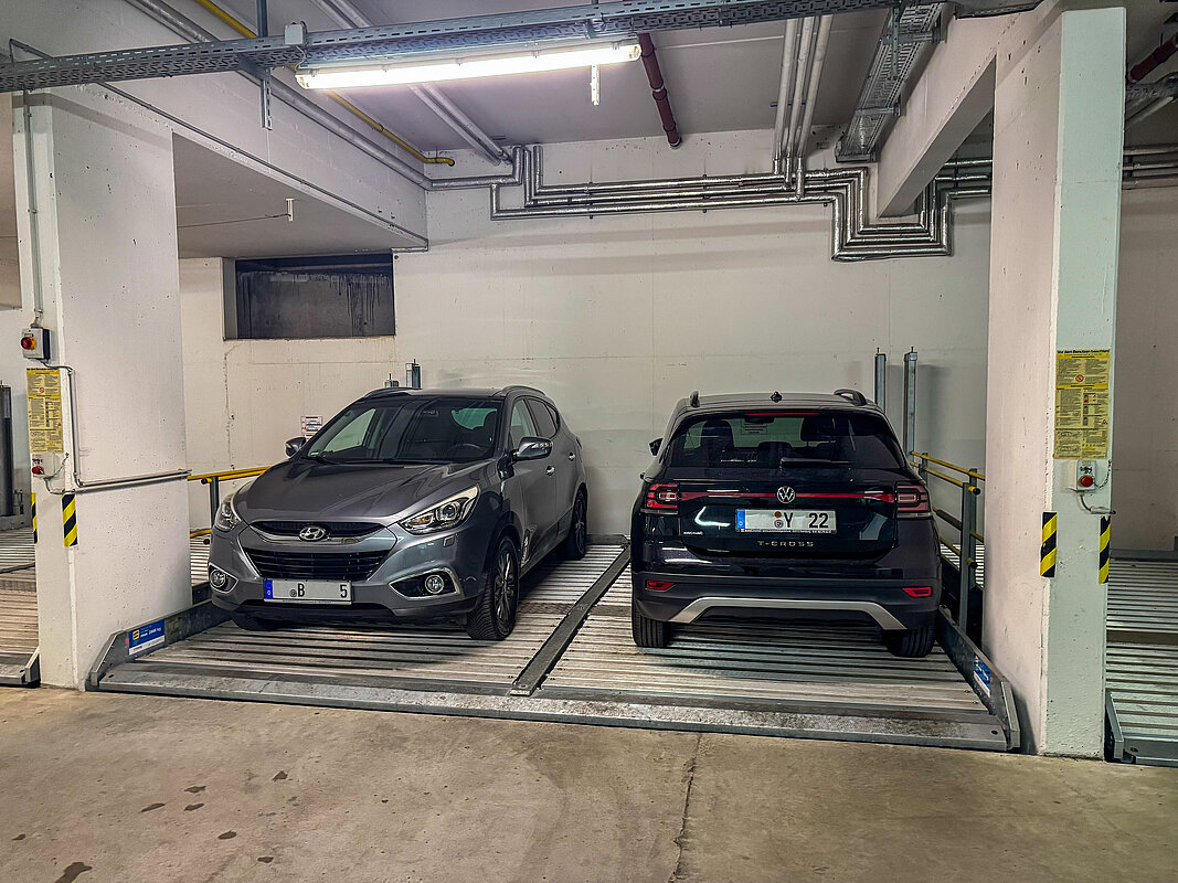 Unsere hauseigene Tiefgarage erstreckt sich über 400 m² und verfügt über insgesamt 9 moderne Parkersysteme: