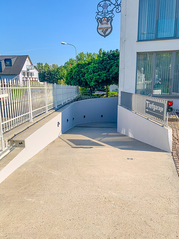 Das Rolltor der Tiefgarage wird abends geschlossen, um Ihr Fahrzeug bestmöglich zu schützen. Bei später Anreise genügt ein Klingeln am Tiefgaragentor und unser Team öffnet Ihnen den Zugang.