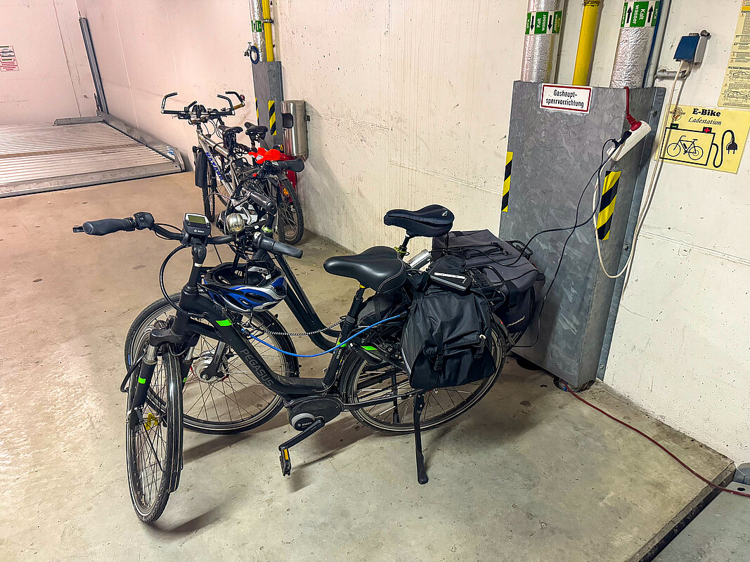 Unsere Tiefgarage bietet auch Platz für Fahrräder. Hier können Sie Ihr Fahrrad sicher abstellen. Es stehen zwei Steckdosen für das kostenlose Laden von E-Bikes zur Verfügung. Auch Motorräder finden im Hof oder in der Tiefgarage einen geschützten Platz.